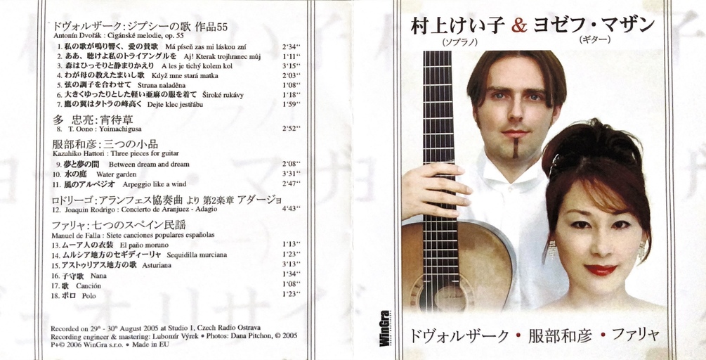 Josef Mazan (guitar) and Keiko Murakami (soprano) on a CD recorded in August 2005 at Studio 1, Czech Radio Ostrava. The album includes A.Dvořák's Gypsy Songs (all 7 movements of the cycle), M.Falla's 7 Canciones Espagñolas, solo guitar compositions by Dvořák, Albeniz and Hattori and much more.